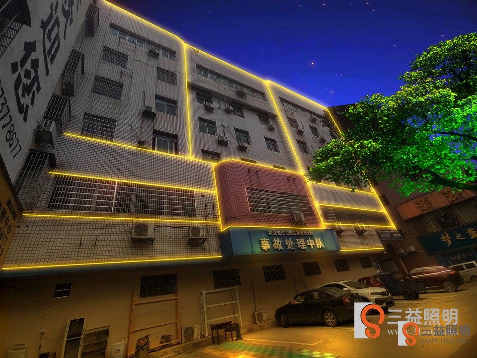 桃江縣公安交警大隊(duì)、事故入處理中心外墻燈光設(shè)計(jì)方案,采用線條燈勾勒大樓輪廓。