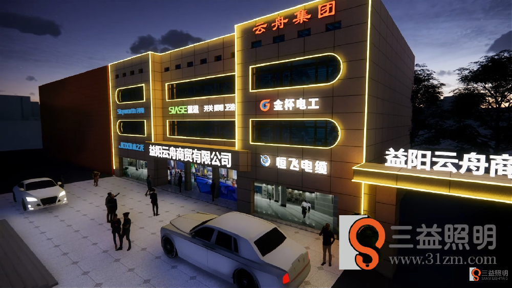 益陽(yáng)市云舟商貿(mào)公司外墻燈光設(shè)計(jì),設(shè)計(jì)采用LED無(wú)縫線(xiàn)條燈,不銹鋼發(fā)光字。