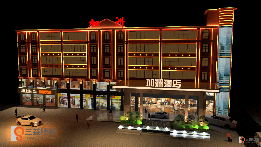 益陽(yáng)加洲酒店外墻亮化工程設(shè)計(jì),本工程設(shè)計(jì)采用DMX512線(xiàn)條燈、DMX512硅膠燈制作全彩效果。