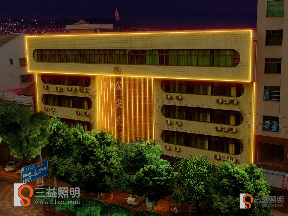 桃江縣公安交警大隊(duì)、事故入處理中心外墻燈光設(shè)計(jì)方案,采用線(xiàn)條燈勾勒大樓輪廓。